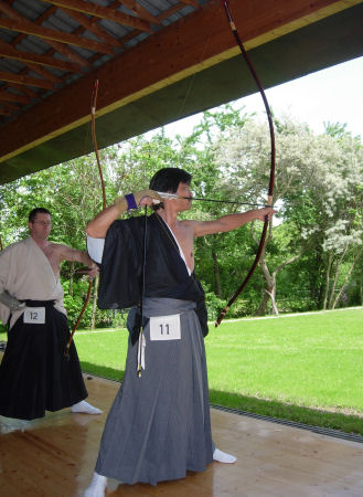 Dans une cérémonie de Kyudo, il y a deux éléments importants. En premier, c'est de bien tirer, évidemment. Le deuxième est l'étiquette du tir, autrement dit le protocole. Nous devons faire le Kyudo élégamment en respectant les autres personnes et le lieu du tir. Pour le premier élément, il y a une phrase, "Sheisha Hitteki" qui signifie "avec un tir correct, la flèche entre toujours dans la cible". Elle a l'air très banale et simple mais si nous considérons la difficulté, en général, de mettre la flèche dans la cible, alors elle prend beaucoup de sens. Elle nous invite à faire plus d'efforts. Le "Do" est la voie ou le chemin. Ce chemin est le chemin du Kyudo, mais il est aussi le chemin de la vie. Le passé et le présent nous amènent au futur. Avec la globalisation de notre vie quotidienne, beaucoup de choses changent plus vite qu'auparavant. Nous avons peut-être perdu l'habitude de perfectionner une chose, car de nouvelles choses arrivent et prennent place avant que nous ayons appris à perfectionner la première. La vie actuelle nous demande d'être rapides et efficaces. Le Kyudo offre l'opportunité de perfectionner une chose dans la profondeur. En répétant les mêmes gestes, nous avançons petit à petit dans le chemin du Kyudo, dans la direction de la perfection. Ce chemin est si long qu'il n'y a pas de sens à se stresser pour vouloir arriver plus vite. De plus, une avancée trop rapide entraîne souvent une période de stagnation. Avec un bon maître et des efforts, nous pouvons avancer sûrement. 'histoire du Kyudo Le tir à l'arc existe depuis le début de l'existence des humains sur terre. Le Kyudo s'est développé comme art martial pendant l'ère des Samurai, le Samurai est un mot japonais qui signifie guerrier. Comme les autres arts japonais, l'ère Edo (1603 - 1868) qui a été dirigée par des Samurai, a contribué beaucoup au développement du Kyudo. Pour cette période, pendant plus que 250 ans, le Japon avait fermé les portes pour les étrangers. Le Shogun, donc le chef du féodalisme, avait dirigé tout le pays et le Japon a connu une longue période de paix. Le flux des gens et des marchandises dans tout le Japon était assuré par le Shogun. Grâce à ces conditions favorables, le Japon a prospéré et a développé les cultures qui sont connues comme typiquement japonaises, par exemple, le Sa-Do (la cérémonie de thé), le Ka-Do (l'arrangement des fleurs), le Ukiyoé (les estampes), le Kabuki (le théâtre), le No (le théâtre) et bien sûr le Kyudo. Pendant cette époque de Samurai, le Kyudo a été appelé "Kyujutsu". Le mot "Kyujutsu" signifie : " Technique de tir à l'arc ". Il y avait et il y a encore beaucoup d'écoles traditionnelles de tir à l'arc au Japon. Elles gardent les méthodes et la philosophie qui se sont créées dans l'époque de Edo, c'était l'époque des Samurai. Le mot Kyudo est né dans l'ère Meiji qui est juste après l'ère Edo. Entre les deux ères, il y avait un très grand changement de la structure de la société. La classe des Samurai avait perdu son pouvoir, et le Japon avait ouvert les portes au monde. Le nombre des praticiens de Kyujutsu avait diminué car il n'y avait plus de Samurai. Avec beaucoup d'effort de beaucoup de personnes, le Kyujutsu a été transformé en Kyudo qui est un art martial plus orienté sport et qui convient à tout le monde. Une nouvelle forme de tir a émergé qui est le Kyudo moderne. Dans ce nouveau Kyudo, nous cherchons non seulement l'efficacité du tir mais aussi le chemin de la Vie et du perfectionnement de soi. Si vous êtes intéresé au